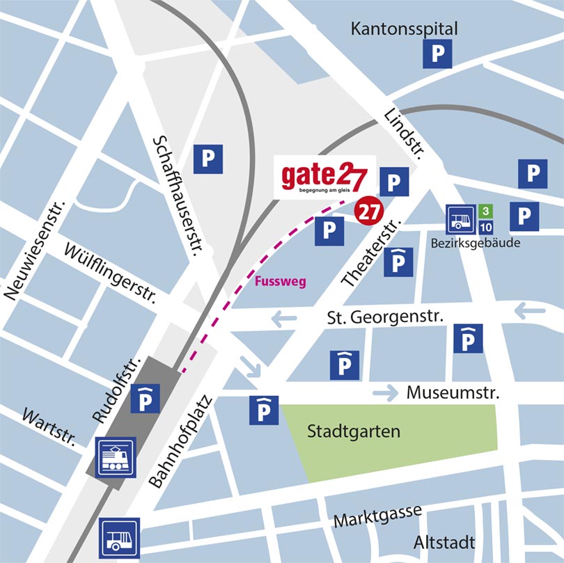 In 5-10 Gehminuten vom Hauptbahnhof. Dem ausgeschilderten Fussweg entlang der Bahnliniein Richtung Kantonsspital Winterthur (KSW) folgen.